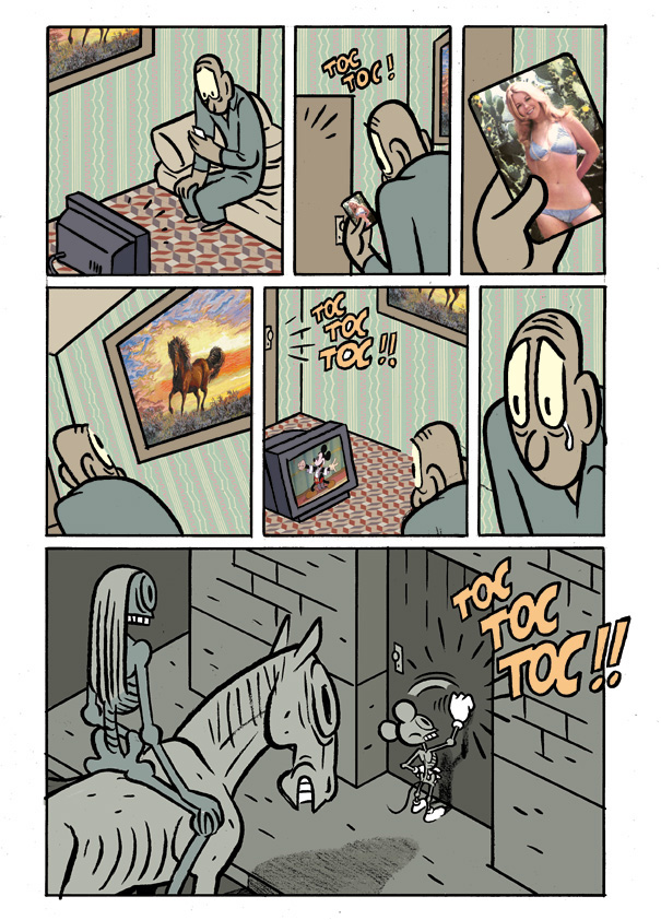 From another drawn concert in Kosmópolis 2008. This time with Sonia Pulido and Calpurnio, and again the band Neosol. We worked on a micro-tale by Augusto Monterroso: "The last man alive on Earth is sitting alone in his room. There's a knock on the door." Again I had previously prepared a layout and background samples, but this time I wasn't so stressed.