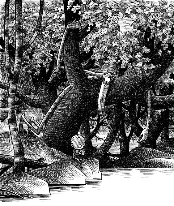Las versiones en blanco y negro y color de un dibujo para la Agenda Injuve del año 2000. Si os fijáis, en el follaje sobre la cabeza del Ojáncano aparece un Hombre Salvaje, a medio hacer en la primera versión y completado en la segunda.