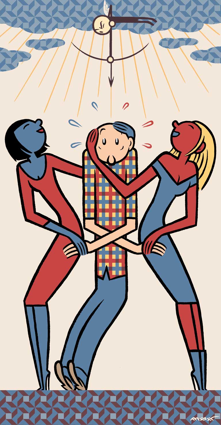 Una mano inocente sacó el papelito de la chistera y a mí me tocaron en suerte los enamorados. Forma parte de la baraja "El Tarot del General Clúster", recién editado por el Clúster de Còmic i Nous Media de Mallorca, los 22 arcanos mayores del Tarot dibujados por otros tantos autores/as de la isla, que se puede conseguir aquí. Abajo tenéis la imagen del clásico Tarot de Marsella de la que partí.