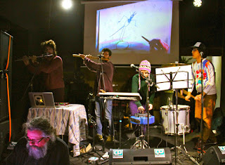 Más dibujos del concierto dibujado con Berberian, Pascal Comelade y la Bel Canto Orquestra en Madrid. El tercero fue un pequeño gag: lo hicimos tranquilamente en el camerino antes del concierto y lo pusimos sobre la mesa justo tras un tema musical de apenas dos minutos en que la pantalla y el escenario quedaron totalmente a oscuras. El cuarto dibujo me parece el mejor de todo el concierto: Berberian y yo fuimos desbarrando conforme el clímax musical iba subiendo en volumen hasta el caos final (era una versión de "Russian Roulette" de The Lords of the New Church).