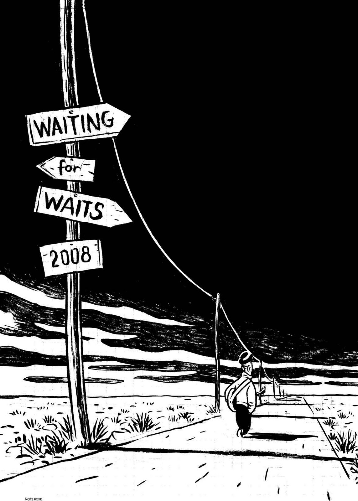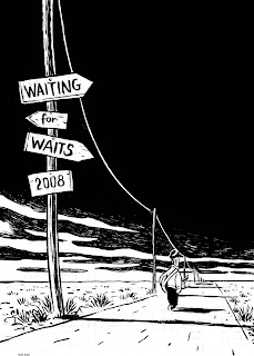 En 2008 me encargaron el cartel del ciclo musical Waiting for Waits. Un ciclo increíble que nació en 2001 con la idea de su promotor, Tomeu Gomila,  de conseguir que Tom Waits quisiera venir algún día a tocar en Mallorca. Mientras tanto, todos los músicos que han participado aceptaban finalizar su actuación interpretando una canción de Waits. Ha pasado gente tan grande como Howe Gelb, Bonnie Prince Billy, Bill Callahan, Lisa Germano... Ese año, 2008, Waits actuó en Bilbao. Se le hizo llegar el póster a su habitación de hotel, pero no hubo respuesta. Hartos de esperar, el ciclo terminó en 2010. Aquí van el boceto, el dibujo original y el cartel terminado. Sí, le debo mucho a Crumb.